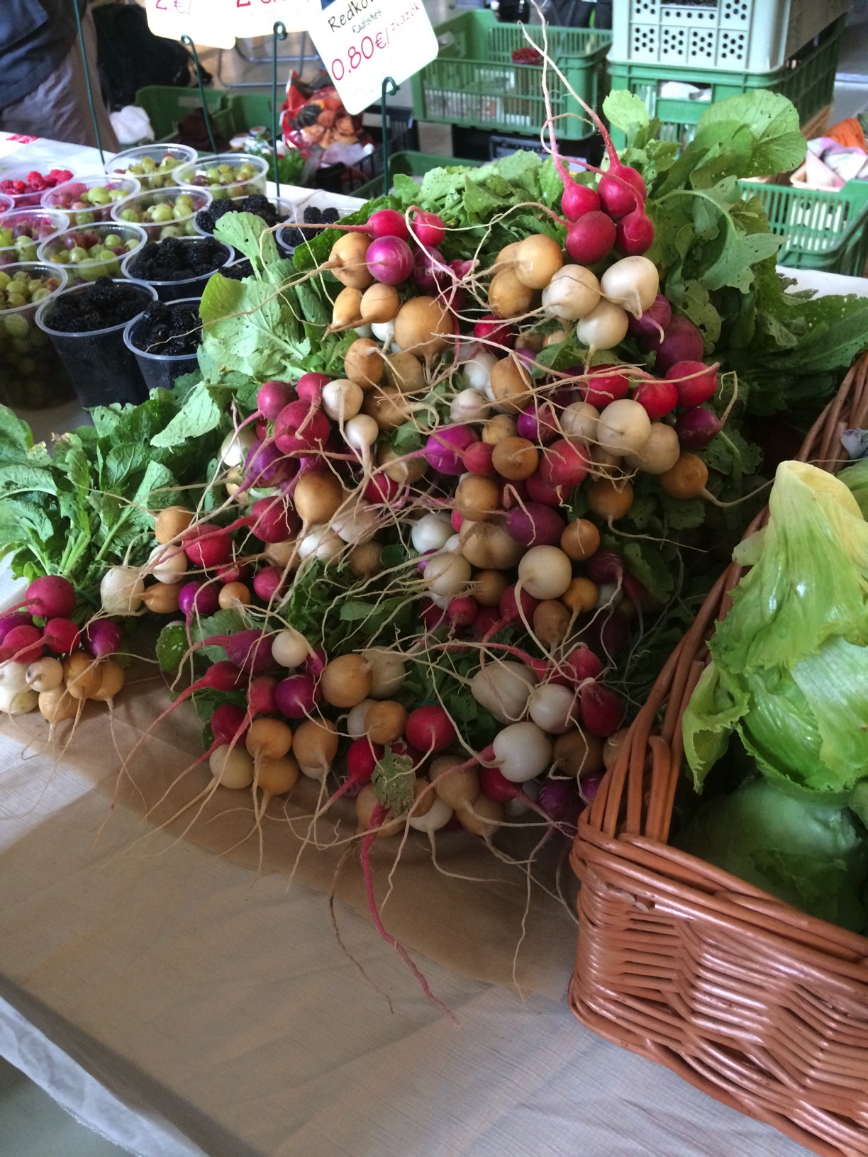 Of course, we also found a small farmers market a few minutes from where we were staying, so all became right with the world again. It was advertised as a German Market but I was not too sure as to what made it German? There were some amazing produce sellers with fresh herbs and berries, a pickle vendor (He was so excited), a bunch of people selling local bottles of wine, and even a bar selling pints of craft beer – it was too early in the morning for us, but kudos to those enjoying their first pint at 10am. We had a good time looking at all of the homemade baked goods too. We bought some of the radishes pictured and boy where they snappy.