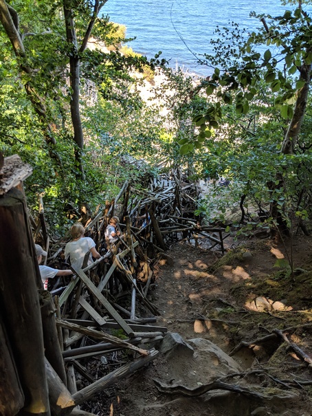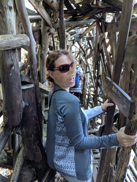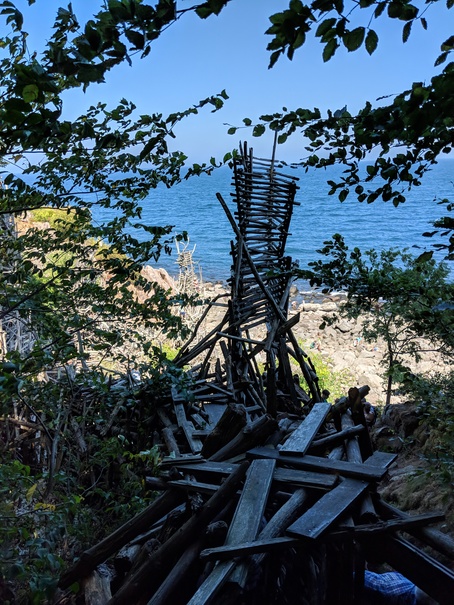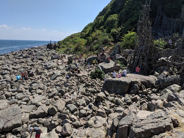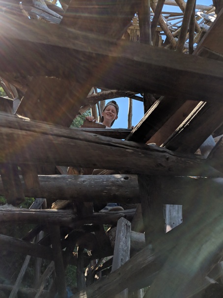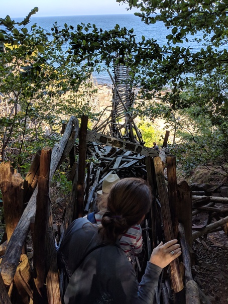 Near the bottom of the hill, but not yet at sea-level is the entrance to the faux-country Ladonia, which is itself the upper entrance to the sculpture Nimis. Yep, the sculpture has an entrance. This thing is huge. Like a tree-house made by 200 kids hopped up on speed, you walk through narrow passage ways, climb up rickety structures, watch your footing on rotting or rotted wood and squeeze yourself through too-tight openings all the while trying to remember the last time you had your tetanus shot. To make an interesting day even more so, I happily volunteered to look after, which meant trying to keep up with my soon 11-year old nephew who basically flew around the structure in places that would never in a million years hold my weight.